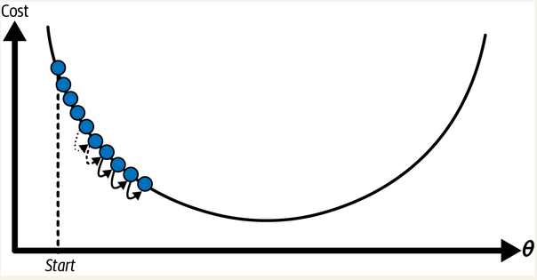 这就是梯度下降:它会测量误差函数相对于参数权重向量θ的局部“梯度”(可以理解为山的陡峭程度),并朝着梯度下降的方向前进。一旦梯度为零(路面平了,四周都是上山的路),就达到了最小值