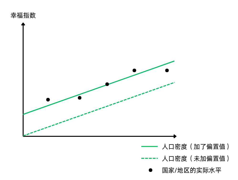 这里的偏置值,就是给整体幸福指数加一个值做微调。我们还是可以用二维图像来举例: