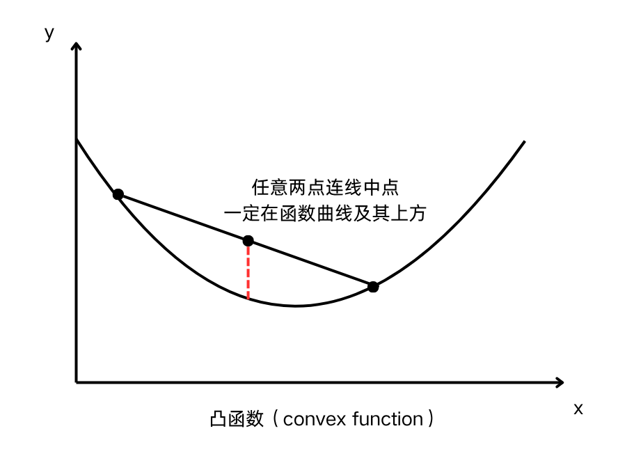 好在,均方误差对线性回归求成本函数,图像是一个凸函数(convex function)。这种函数图像上任意两点连线的中点一定在函数曲线及曲线以上的位置。因此,它没有局部最小值,通过梯度下降一定能找到它的全局最小值