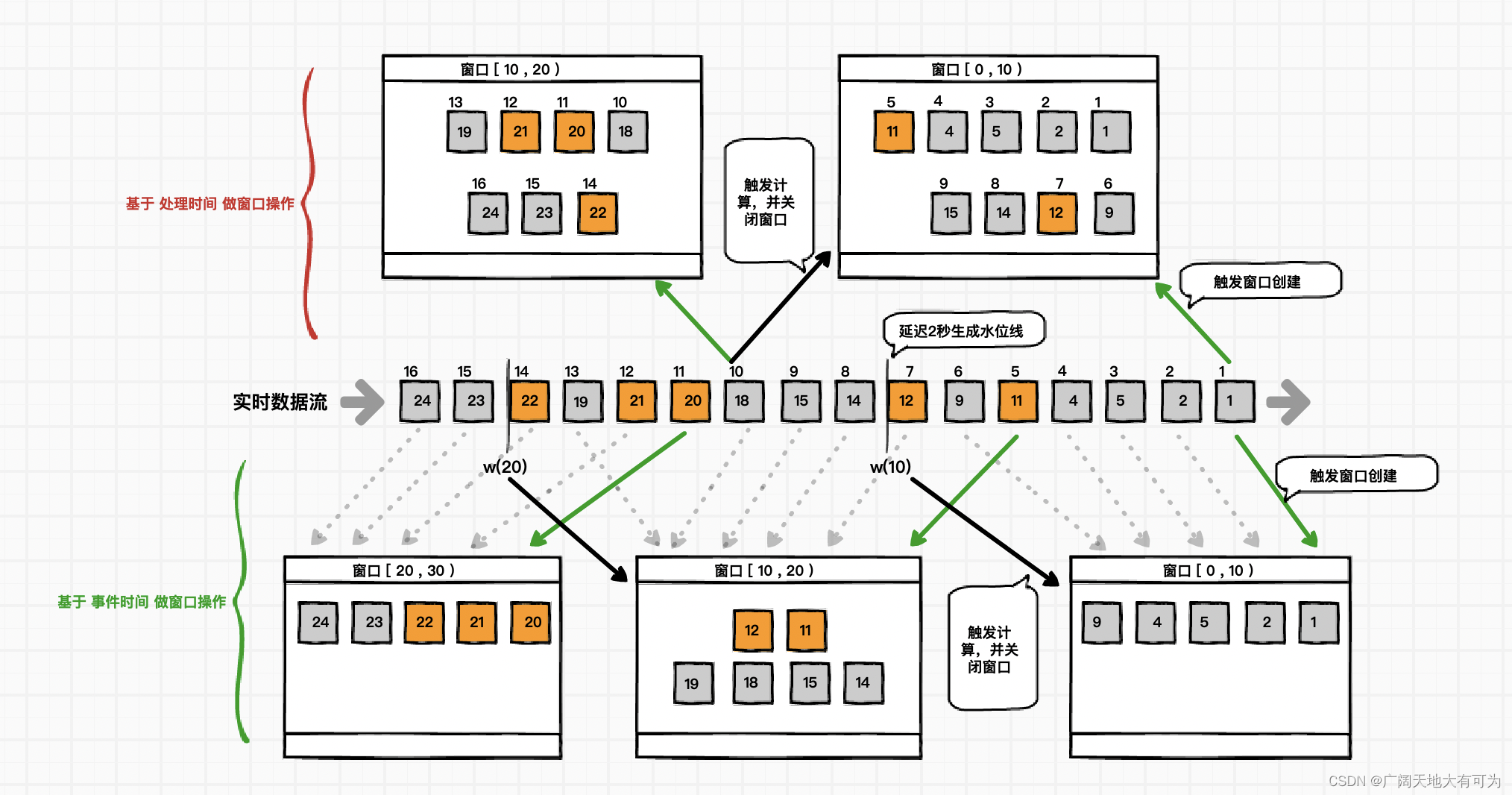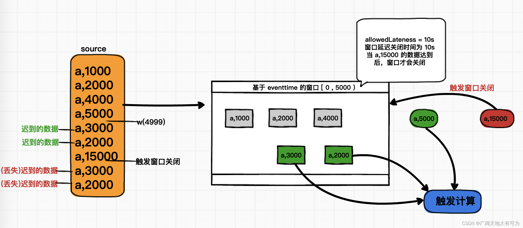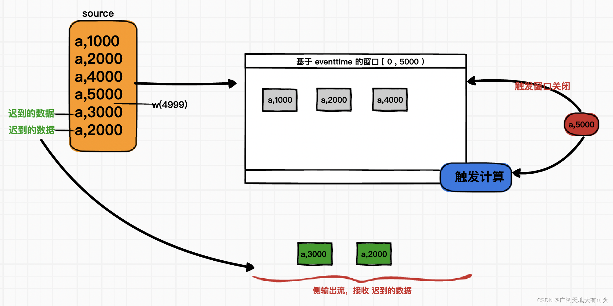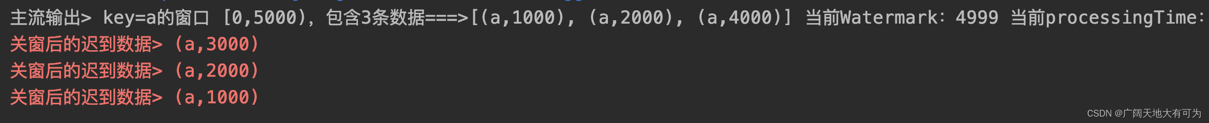 注意:迟到的数据超过了设置的最大乱序时间,将会被丢弃