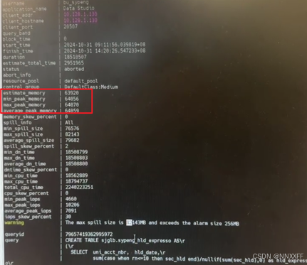 【结论】综上,根据资源池CCN排队原理分析,默认资源池出现CCN排队原因为当前集群可用动态内存小于待执行入库SQL的估算内存,而出现排队时,集群中存在连个占用120GB+内存SQL,导致集群可用动态内存较小,触发CCN排队。