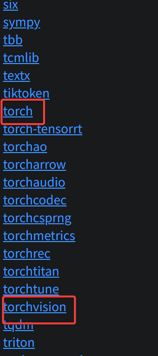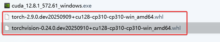 分别点进去,找到CUDA12.8对应最新的torch(20250909)和torchvision(20250910,日期必须在torch后面)版本