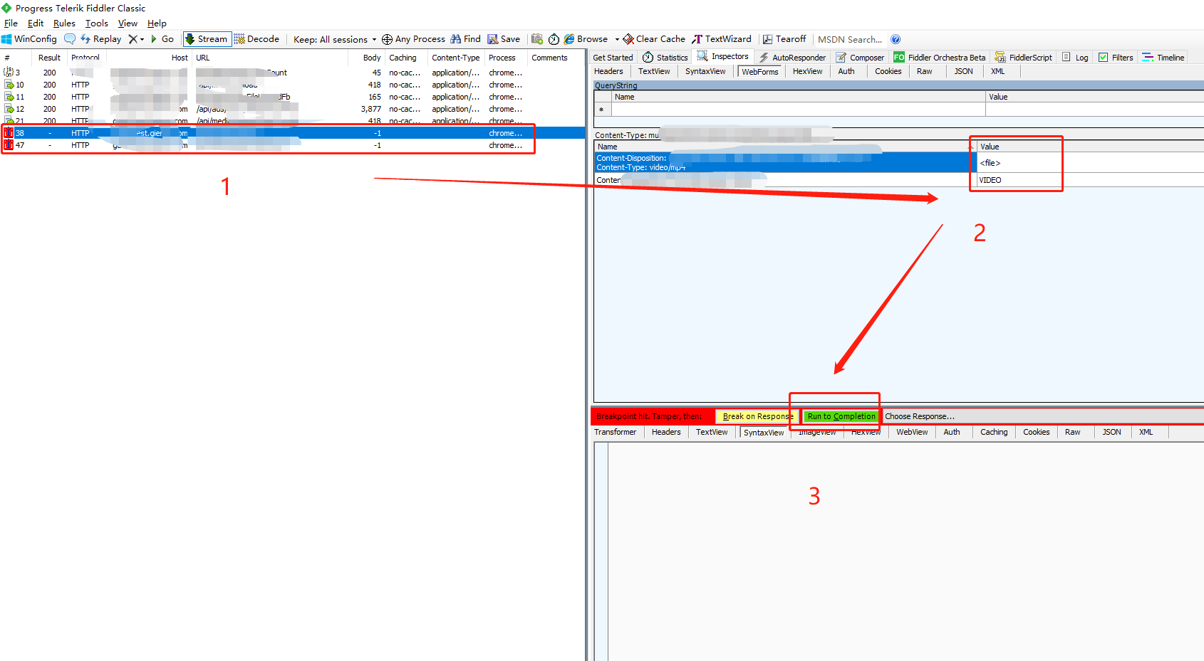 拦截到接口后 Fiddler会闪,接口前面有红色的标注,点击相应需要修改的接口参数,Inspectors里修改参数即可,最后Run to Completion 即可,见下图