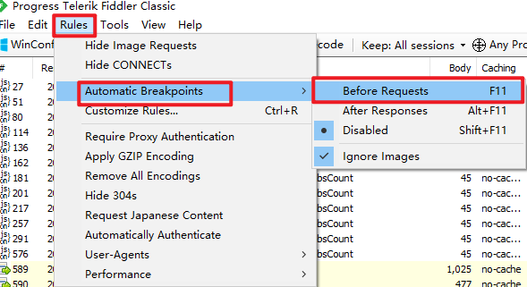 1、修改请求头参数。Rules》-Automatic Breakpoints》-Before Requests