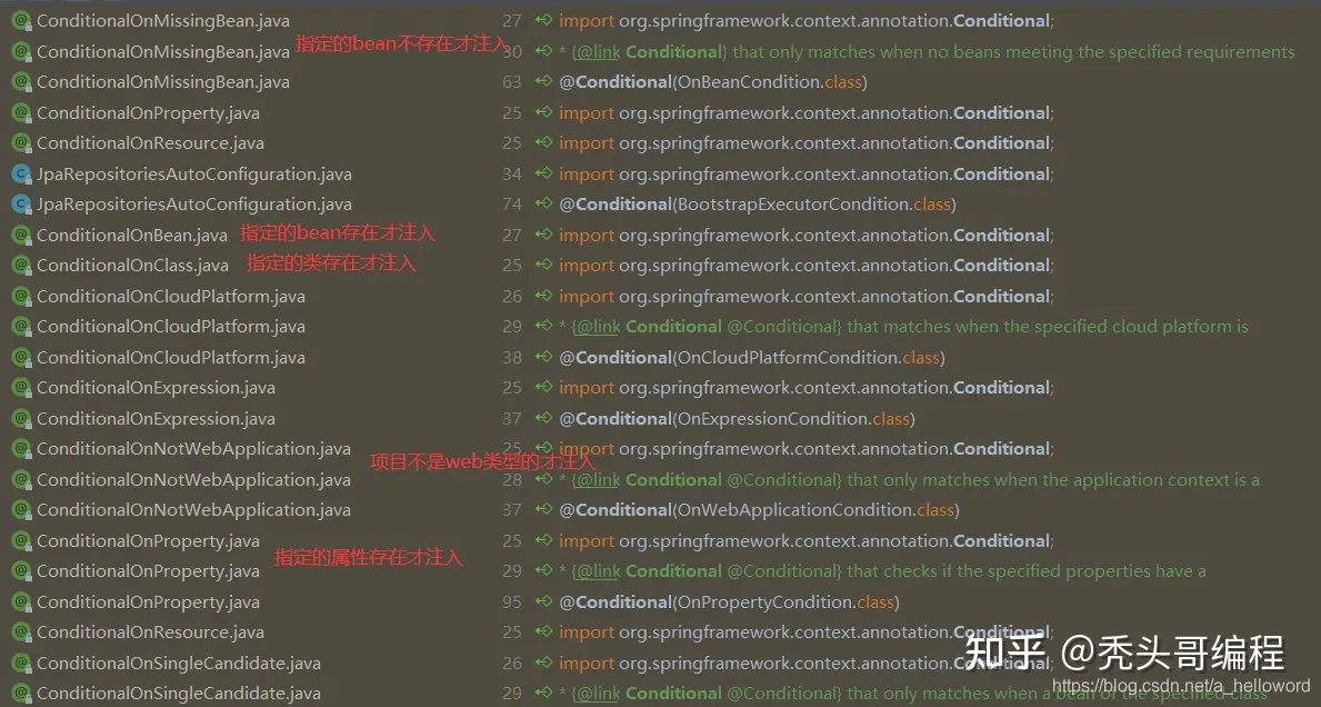 @ConditionalOnBean:当容器里有指定 Bean 的条件下@ConditionalOnMissingBean:当容器里没有指定 Bean 的情况下@ConditionalOnSingleCandidate:当指定 Bean 在容器中只有一个,或者虽然有多个但是指定首选 Bean@ConditionalOnClass:当类路径下有指定类的条件下@ConditionalOnMissingClass:当类路径下没有指定类的条件下@ConditionalOnProperty:指定的属性是否有指定的值@ConditionalOnResource:类路径是否有指定的值@ConditionalOnExpression:基于 SpEL 表达式作为判断条件@ConditionalOnJava:基于 Java 版本作为判断条件@ConditionalOnJndi:在 JNDI 存在的条件下差在指定的位置@ConditionalOnNotWebApplication:当前项目不是 Web 项目的条件下@ConditionalOnWebApplication:当前项目是 Web 项 目的条件下