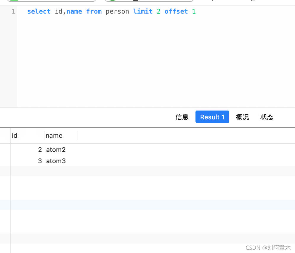 使用 limit X(几行) offset x(从第几行起) select name from person limit 2 offset 1