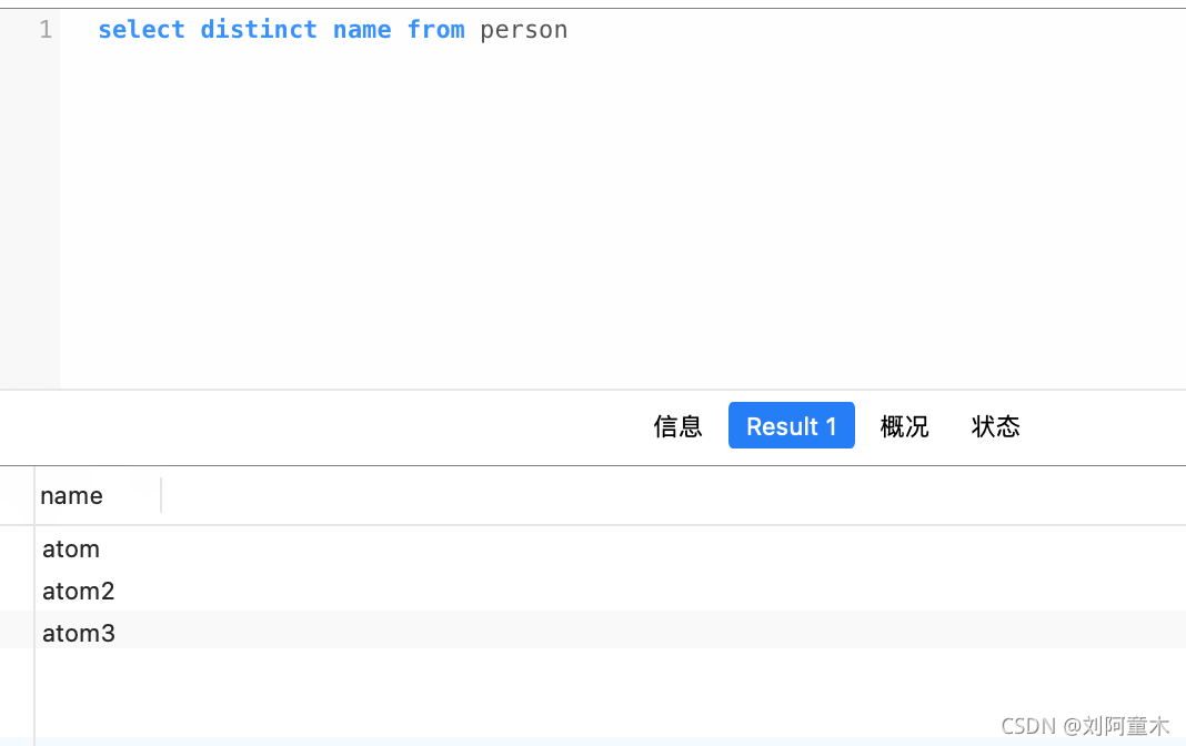 使用distinct 这样搜索出来的就是不重复的了 select distinct name from person