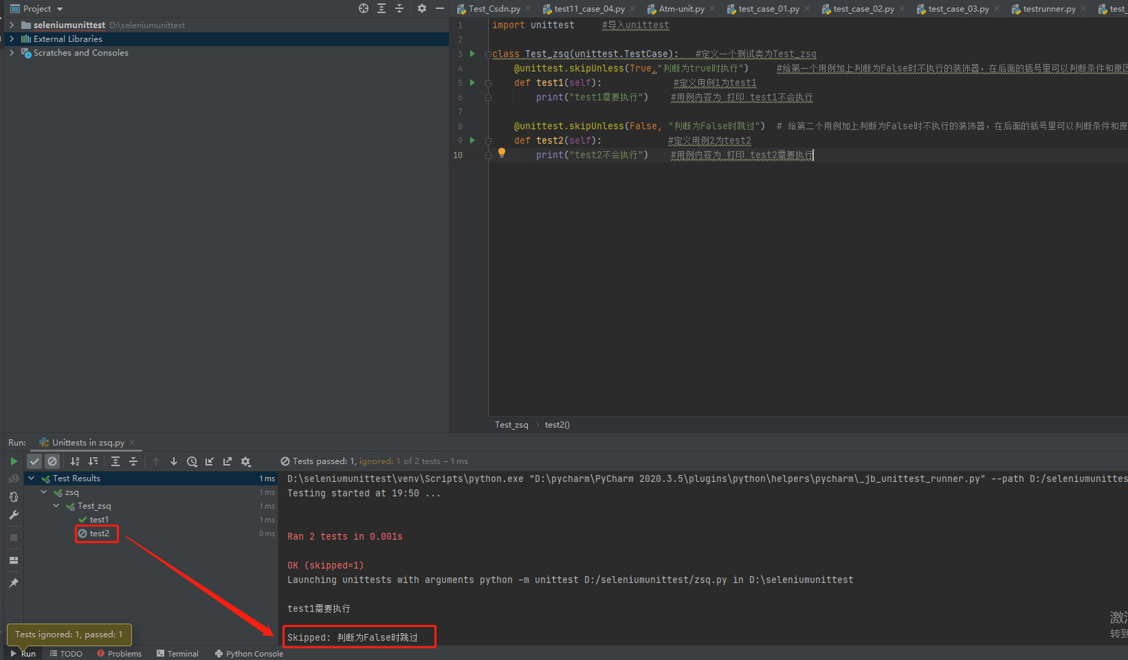 @unittest.skipIf()为条件判断为True时会跳过该条用例,括号里需要填判断条件和跳过的原因, @unittest.skipIf(判断条件,跳过的原因),可以看下下面例子,用例test1的判断条件为True,所以在执行时,跳过了该用例没有执行,用例test2的判断条件为False,所以对该用例进行了执行。
