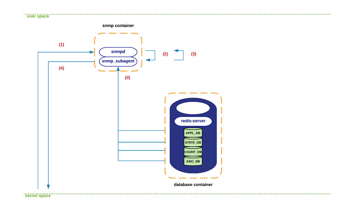 (0) 在snmp-subagent支持的不同MIB子组件初始化时,与上述DBs构建连接。从这刻起,snmp-subagent缓存从所有的DBs获得的状态,这些信息在<60s的时间内更新,来确保DBs和snmp-subagent的同步。