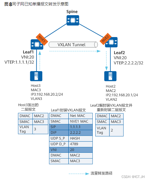 g. Leaf2根据查找到的出接口和封装信息,为报文添加VLAN Tag,转发给对应的Host2。