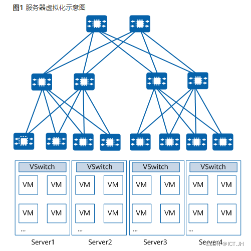 如图1所示,一台服务器可虚拟多台虚拟机,而一台虚拟机相当于一台主机。主机的数量发生了数量级的变化,这也为虚拟网络带来了如下问题: