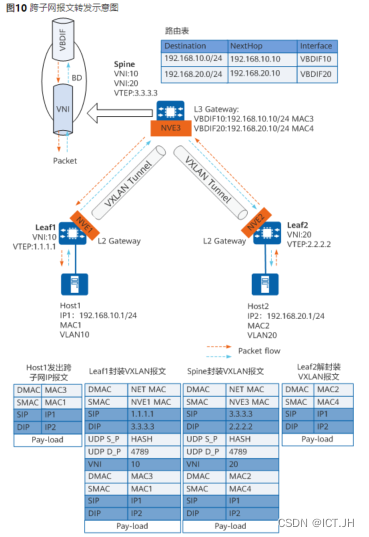 d. Spine剥除内层报文的以太封装,解析目的IP。根据目的IP查找路由表,找到目的IP的下一跳地址,再根据下一跳地址查找ARP表项,获取目的MAC、VXLAN隧道出接口及VNI等信息。