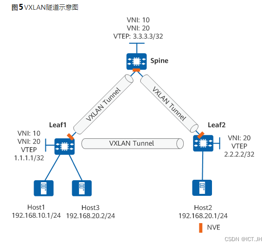注意:对于Host1和Host3之间的通信,虽然都属于Leaf1,但由于属于不同子网,需要经过三层网关Spine,因此也需要在Leaf1和Spine之间创建VXLAN隧道。