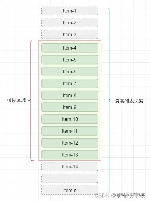 虚拟列表其实是按需显示的一种实现,即只对可见区域进行渲染,对非可见区域中的数据不渲染或部分渲染的技术,从而达到极高的渲染性能。