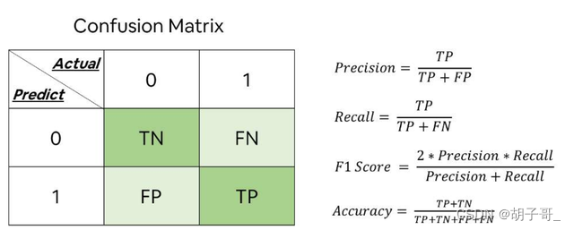如上图,有以下规律:深绿色为预测真确,浅绿色为预测错误,也可以说以T开头的都是预测对的,以F开头的都是预测错误的。比如TP:即预测为真的实际也为真的样本数量,反过来,FP:即为预测为真实际为假,即假真(很拗口,可以把真改为分类更好理解,比如TP:解释为分类1被正确预测为分类1)。(这里是二分类,多分类也可以画一个这个表,左上到右下的对角线上的则为分类预测正确的样本)