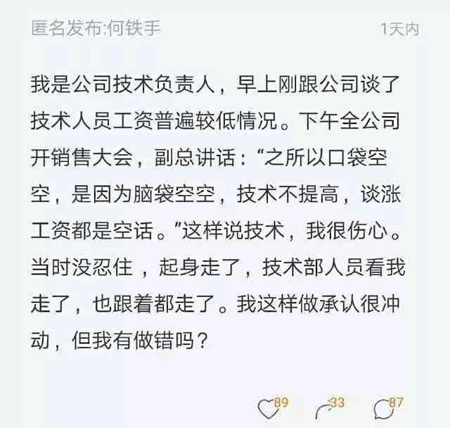 该程序员早上提出自己团队目前薪资较低,提出了想要加薪的请求,但是开会的时候副总说道你们之所以口袋空空,是因为你们脑袋空空,技术不提高,还想加工资?一个领导在开会这样批评员工,确实是情商低的表现,程序员我当时就走了,虽然有点冲动,不知道我这样做的对不对?