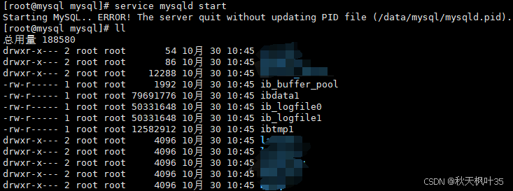 Starting MySQL.. ERROR! The server quit without updating PID file (/data/mysql/mysqld.pid). xtrabackup恢复数据,mysql数据库服务启动失败