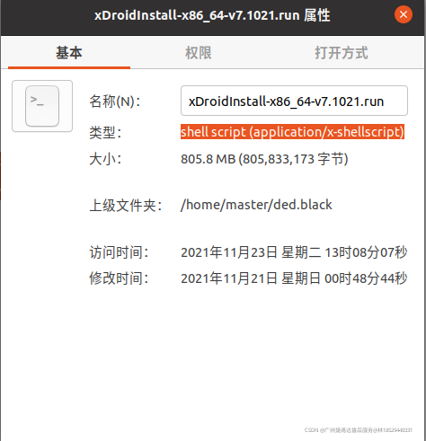 找了一圈又回到这个xDroid工具,从网站下载一个安装包xDroidInstall-x86_64-v7.1021.tar.gz,在ubantu直接解压出来,就得一个文件:xDroidInstall-x86_64-v7.1021.run,前面装上的应用,没有一个能直接运行安装,查看文件属性,文件类shell script (application/x-shellscript),原来是shell脚本类的安装包