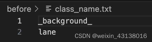 关于如何使用labelme标注数据在这里不做详细介绍,网络上有很多教程,假设我们现在已经有了labelme标注好的数据。我们将标注好的json文件和原图片放在同一文件夹下,这里我把他们放在before文件夹下。然后在before文件夹下新建一个class_name.txt文件,并在里面写明你所标注的类别,本人只是做一个火车轨道的识别,所以只有_background_和lane两个类别。