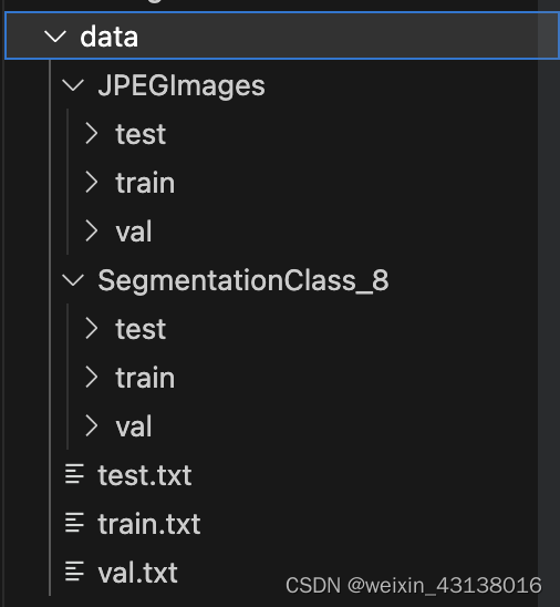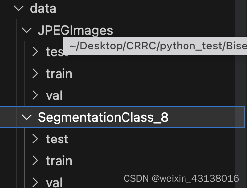 然后将里面的所有img.png和label.png分别取出来,分别放在JPEGImages文件夹下和SegmentationClass文件夹下。可以通过moveSrcMasksImage.py实现。