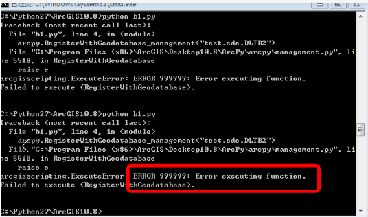 执行acrpyRegisterWithGeodatabase.py脚本时报错"ERROR 999999"。