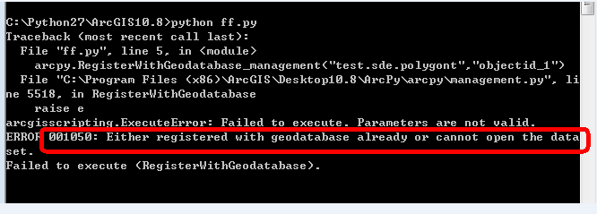 执行acrpyRegisterWithGeodatabase.py脚本时报错"ERROR 001050"。