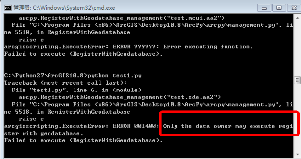 执行acrpyRegisterWithGeodatabase.py脚本时报错"ERROR 001400"。