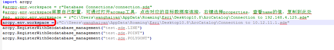 - 编辑acrpyRegisterWithGeodatabase.py文件,将上一步复制的内容粘贴到以下位置,保存文件。