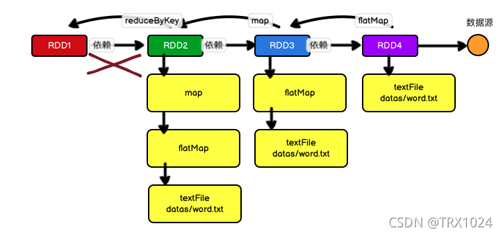 - RDD4依赖于文件datas/word.txt,它是通过textFile算子得到的,RDD4会保存这个依赖信息