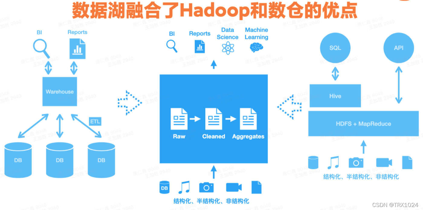 这一切问题在Hadoop问世后都发生了重大转变,Hadoop脱胎于Google的“三驾马车”,借助Google的先进理念,再通过开源的方式提供给广大用户,可以说Hadoop由此成为了大数据分析的分水岭。企业从此有了一个很有吸引力的选型,从闭源昂贵的商业数仓,转向开源免费的Hadoop,而且Hadoop可以保存多种多样的数据,包括文本、图片、音视频等,这些都是数据仓库做不到的。
