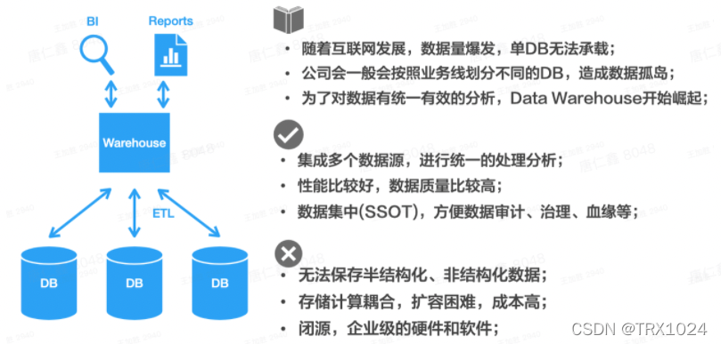在这个背景下,数据仓库(Data Warehouse)开始崛起。数据仓库可以集成多个数据库的数据,进行统一的处理分析,从而解决数据孤岛问题。而且相比关系型数据库,数据仓库的查询性能更高,响应更快。通过这种集中的数据分析(Single Source of Truth),也可以更方便地对数据进行审计、治理等。