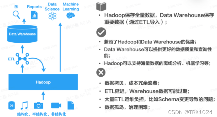 看起来很美好,但是可以看出又回到了早期存在的问题,数据孤岛问题。往往同一份数据在Hadoop和数据仓库中都有一份,除了造成数据冗余、成本浪费,还造成了数据产出口径不一致问题,应该以哪个系统的数据为准有时候说不清楚;另外,这种数据架构带来了运维上的困难,比如Schema的变更很容易导致ETL链路的各种问题,这些都严重影响了从数据到价值的转换效率。