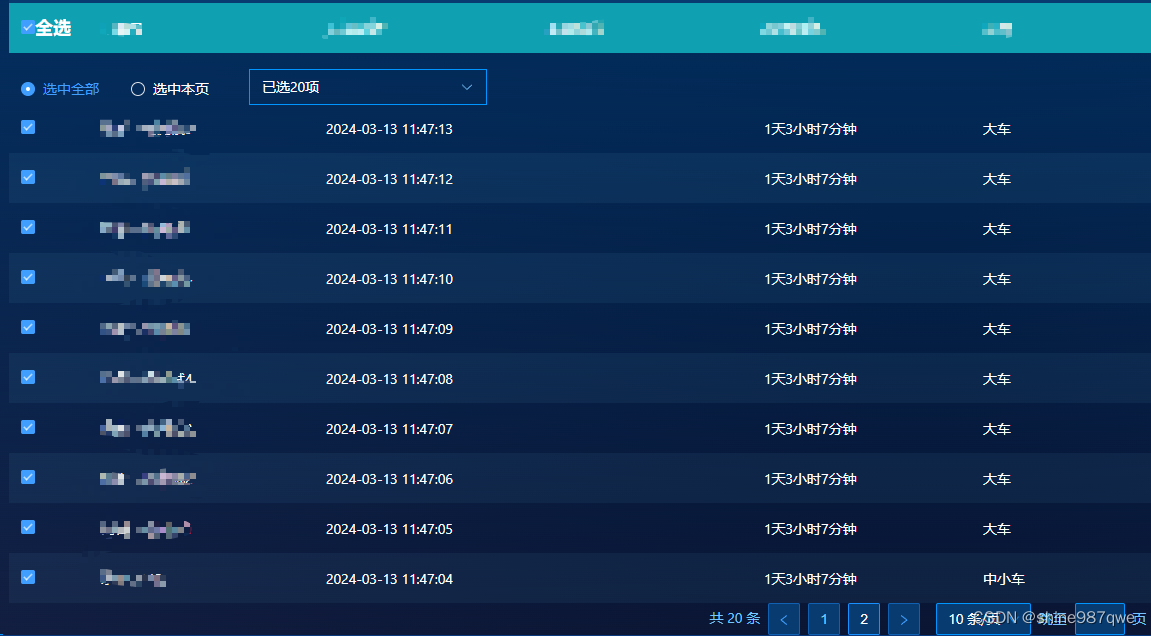 elementui plus实现本页全选和跨页全选 (3)选中或取消table中某一条数据:select方法回调可以拿到已选中的数据和操作的当前行数据。根据操作的这一行数据是否在已选中的数据中来判断是取消还是选中。如果勾选完本页数据,判断当前table则将按钮状态设置为选中本页。判断逻辑:table的每一条数据都在选中数组里面。每操作一次数据:都要判断是否还有选中的数据。(1)点击全选,显示选中全部和选中本页两项配置,默认选中全部数据。选中本页:当前页的列表数据全部勾选且赋值给选中数据。选中:向选中数组中添加该条数据。取消:从选中数据中删除该条数据。