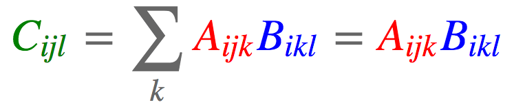 batch矩阵相乘是张量缩约的一个特例。比方说,我们有两个张量,一个n阶张量 [外链图片转存失败,源站可能有防盗链机制,建议将图片保存下来直接上传(img-XjpxTRtw-1638346242591)(https://www.zhihu.com/equation?tex=A+%E2%88%88+%E2%84%9D%5E%7BI_1+%C3%97+%E2%8B%AF+%C3%97+I_n%7D)] ,一个m阶张量 [外链图片转存失败,源站可能有防盗链机制,建议将图片保存下来直接上传(img-bcxUbarY-1638346242592)(https://www.zhihu.com/equation?tex=B+%E2%88%88+%E2%84%9D%5E%7BJ_1+%C3%97+%E2%8B%AF+%C3%97+J_m%7D)] 。举例来说,我们取n = 4,m = 5,并假定 [外链图片转存失败,源站可能有防盗链机制,建议将图片保存下来直接上传(img-kOPgSGxK-1638346242593)(https://www.zhihu.com/equation?tex=I_2+%3D+J_3)] 且 [外链图片转存失败,源站可能有防盗链机制,建议将图片保存下来直接上传(img-1IHW2LbN-1638346242593)(https://www.zhihu.com/equation?tex=I_3+%3D+J_5)] 。我们可以将这两个张量在这两个维度上相乘(A张量的第2、3维度,B张量的3、5维度),最终得到一个新张量 [外链图片转存失败,源站可能有防盗链机制,建议将图片保存下来直接上传(img-orXxlFud-1638346242594)(https://www.zhihu.com/equation?tex=C+%E2%88%88+%E2%84%9D%5E%7BI1+%C3%97+I4+%C3%97+J1+%C3%97+J2+%C3%97+J4%7D)] ,如下所示: