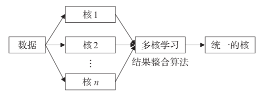 类似于支持向量机方法,利用一个核对数据进行拟合,同样,利用不同的核对不同的输入模态进行拟合,最后结果整合算法对多个核的输出数据进行学习形成统一的核,也就是组合到一个统一的表示空间中,融合过程如上图所示。