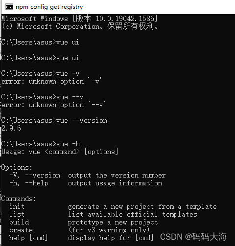 建立vue项目时候在终端输入“vue ui”没有反应 2.如果之前你已经安装cnpm最好,npm安装速度真的很慢。再次输入“vue -h”并没有看到ui组件库。可以看到我已经安装npm、cnpm、node。输入“vue ui”并没有弹出vue网页。原因可能是没有完整安装,因此没有反应。如何知道自己是否安装cnpm。5.输入“vue ui”3.用cnpm安装vue。有这个就是离成功一大半了。1.需要卸载重新安装。