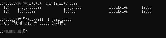 使用 netstat -ano|findstr 1099 查询端口对应的进程