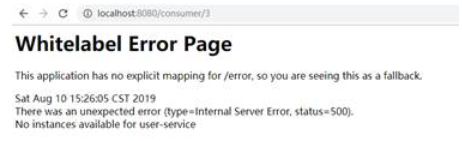 当user-service服务发生异常(此处关闭模拟异常),不会发生如下看不懂错误提示,而是自定义一个提示信息