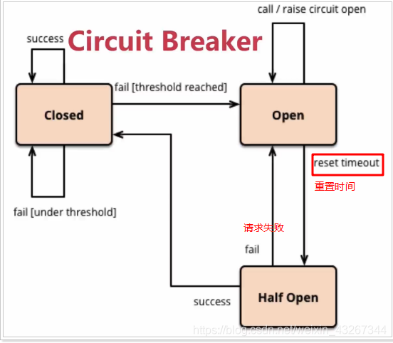 - Half Open:半开状态,open状态不是永久的,打开后会进入休眠时间(默认是5秒),随后熔断器会自动进入半开状态.此时会释放一次请求通过,若这个请求是健康的,则会关闭断路器,否则继续保持打开,在进行5秒休眠及时