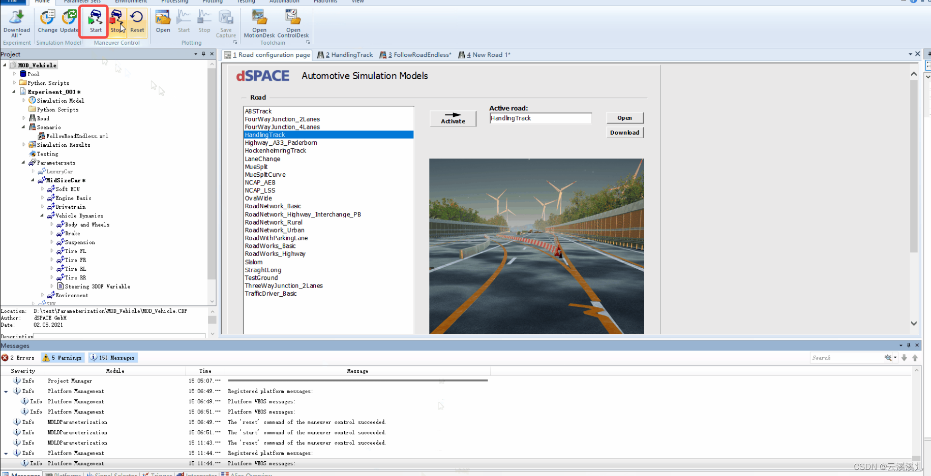 - Experiment:一个实验对应一个场景,对应一个道路,对应一个车辆模型参数,一个工程虽可以包含多个实验,但只能一个处于激活状态。