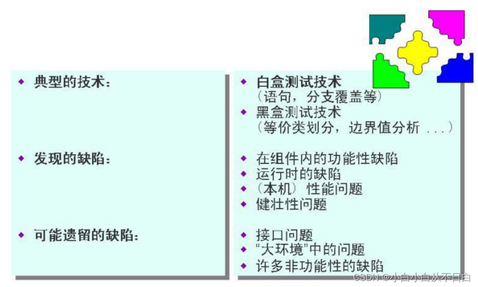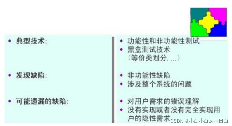 - 测试的对象就是程序本身。忽视了测试活动对需求分析,系统设计等活动的验证和确认的功能,直到后期的验收测试才被发现
