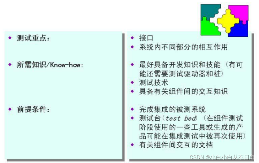 - 集成测试:将已经测试过的单元组合在一起测试它们之间的接口,用于验证软件是否满足设计需求
