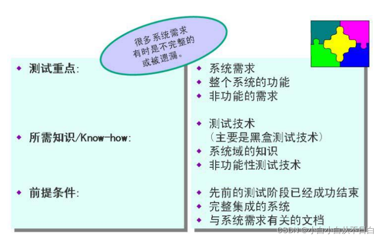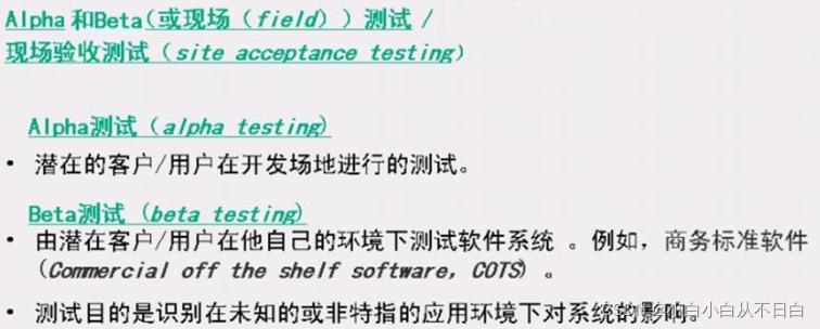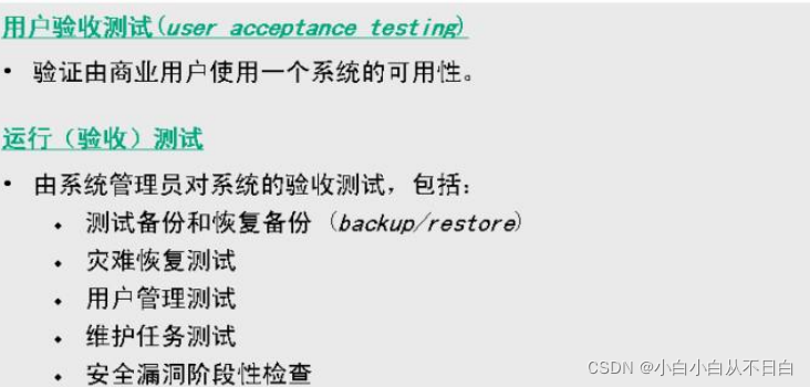 - 验收测试:对软件产品的说明进行验证,逐行逐句安装说明书的描述对软件产品进行测试,确保符合客户的各项要求