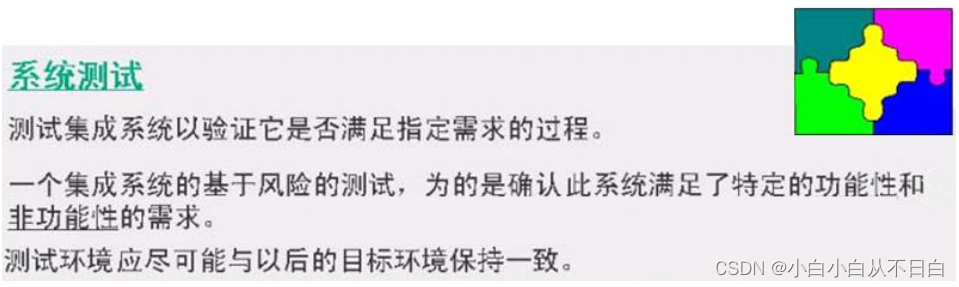 - 系统测试:将经过测试的软件在实际环境中并与其他系统的成分(如数据库、硬件等)组合在一起进行的测试