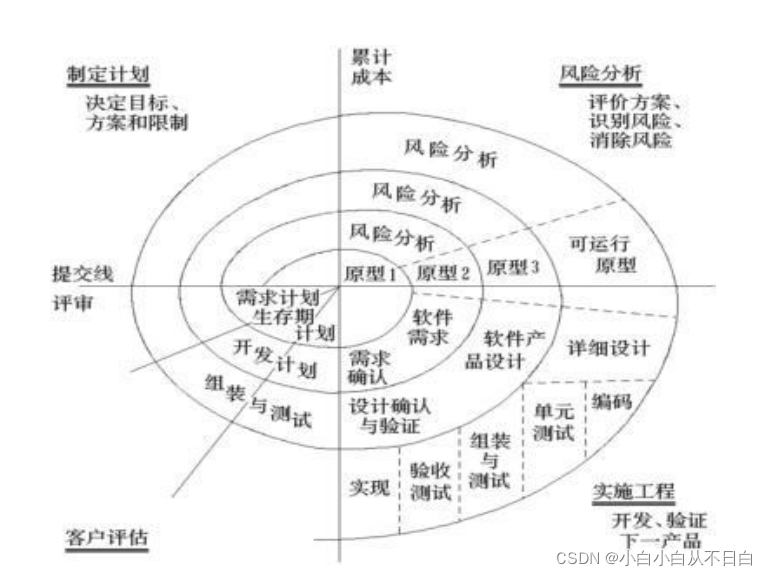 - 引入了其他模型所忽略的风险分析,在进入下一阶段之前需进行风险评估,这样一直循环往复直到完成所有阶段的任务