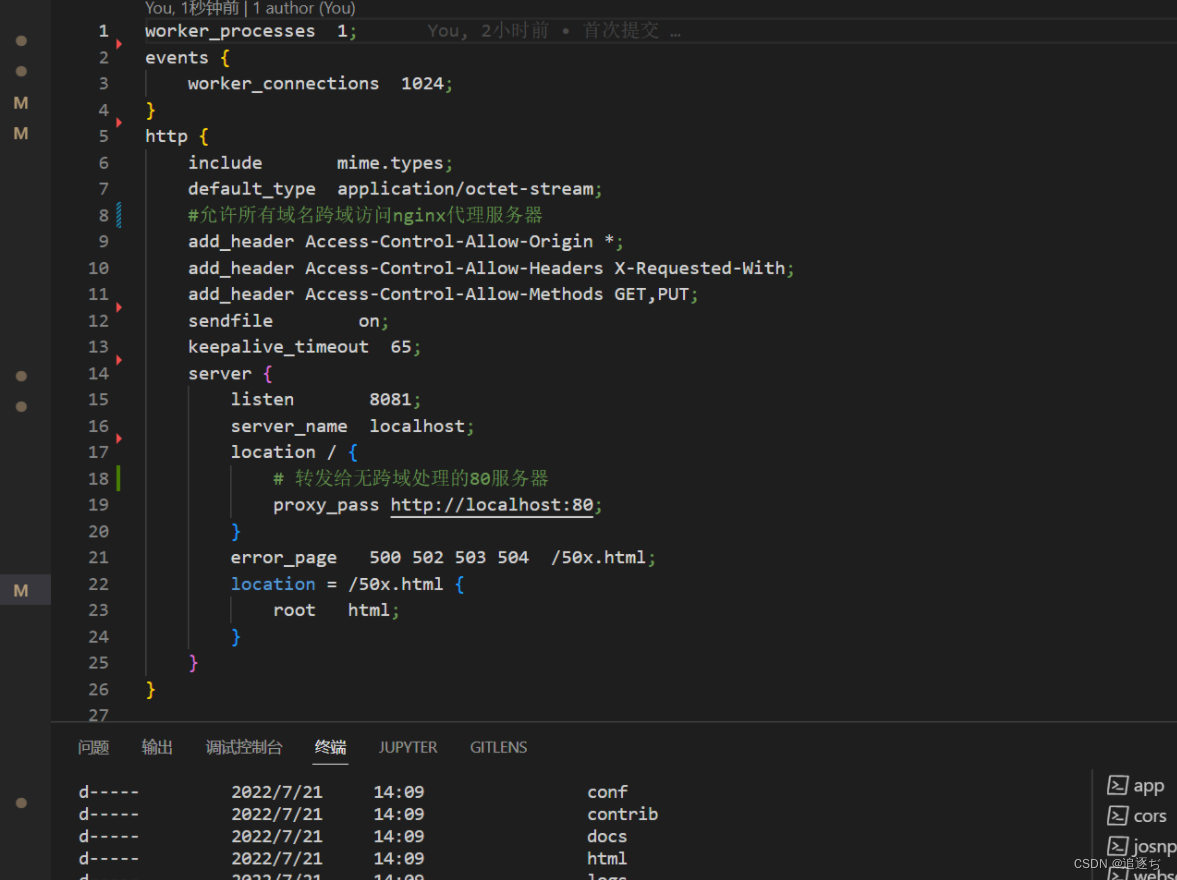 nginx代理转发原理是同源策略只限制于浏览器端的服务器,当后端服务器访问后端服务器时即使是非同源也是可以正常访问的,所以我们构建一个8081端口的nginx服务器,并开启cors使得我们前端的5500端口可以访问该8081的服务器,然后再将请求转发给没有cors的80服务器(即 5500 -> 8081 -> 80)