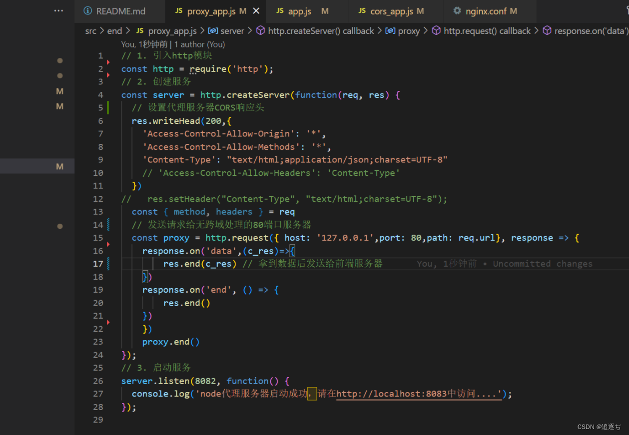 自定义端口为8082的代理服务器,设置跨域cors响应头,请求转发给端口为80的无跨域处理服务器 ↓