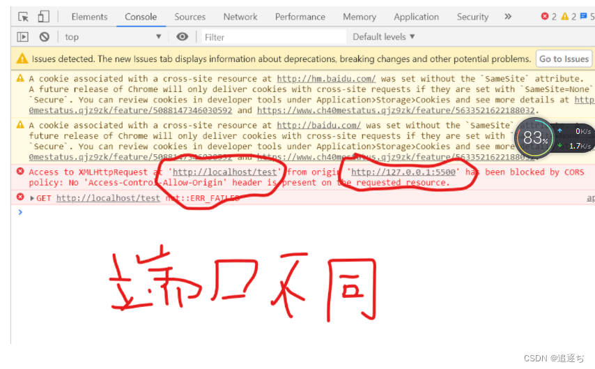 因为前端页面服务跑在5500端口上,去请求没有经过跨域处理的服务端口为80的接口服务器时,因为端口不同受浏览器同源策略的影响,浏览器会阻止非同源的请求。