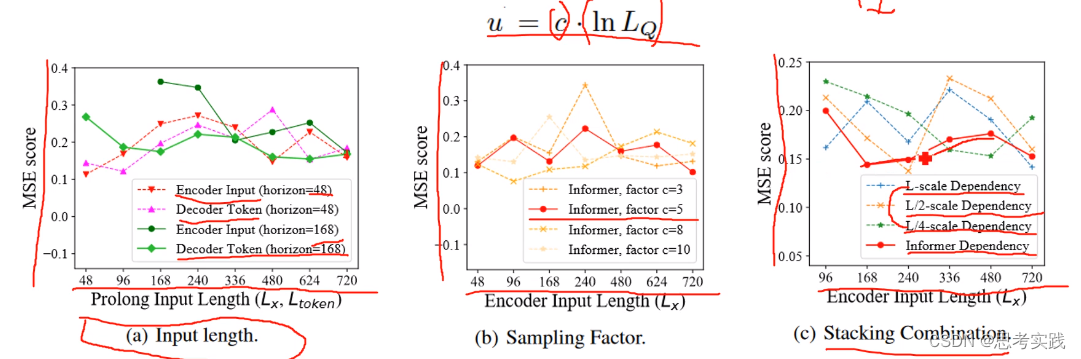 (b)Sampling factor,之前说c与 是有关系的,最终选择的是红色的"Informer with factor c=5"