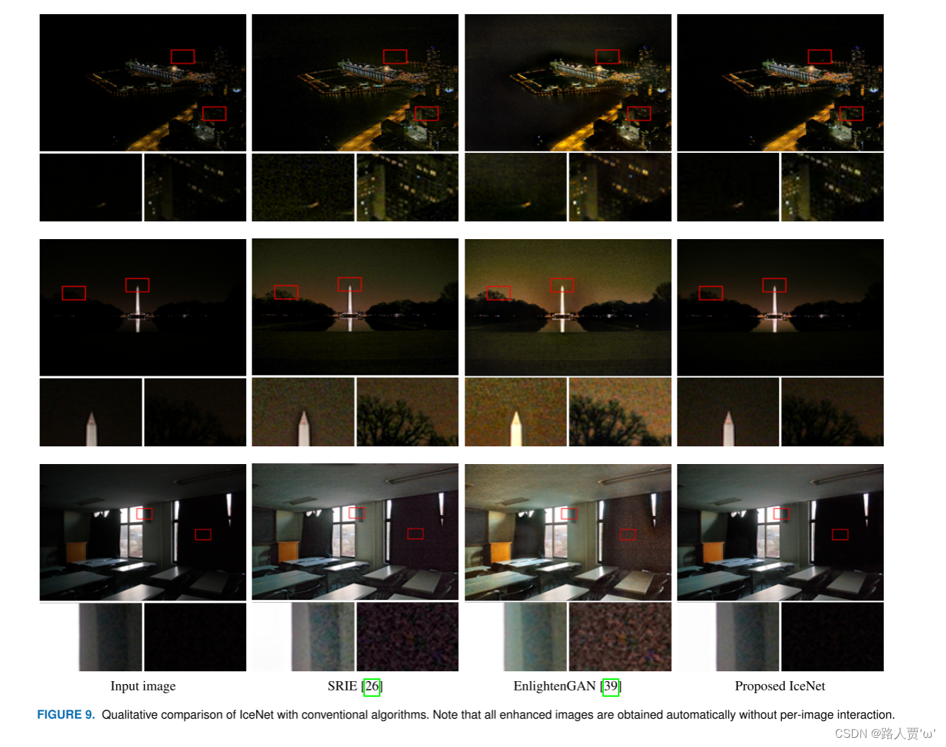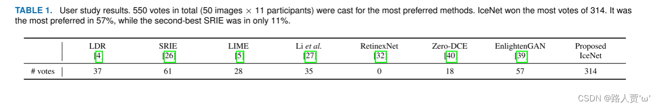请注意,在之前的用户研究中,SRIE 和 EnlightenGAN 是传统方法中最受欢迎的两种算法。表 2(b) 总结了投票结果。所提出的算法赢得了最多的选票。图 9 比较了定性结果,其中 IceNet 的结果是使用参与者的个性化暴露水平获得的。所提出的 IceNet 提供了更令人满意的结果,而无需每个图像交互。